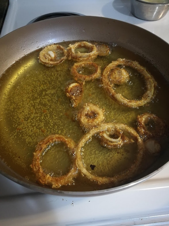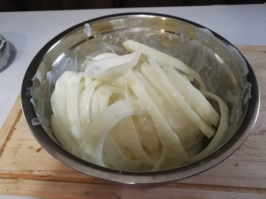 So here is our cast of characters today! 1 pint (2 cups, 473 ml) buttermilk, one large onion, about a cup (125g) of flour. Not pictured: Enough oil to fry, I didn’t measure but it was about an inch deep. Also as an afterthought, I added the following seasonings: Garlic powder, salt, ground black pepper, ground orcish red flakes. I believe it was about a Tablespoon of each. I also stupidly added onion powder. There’s enough onions. You don’t have to add onion powder.