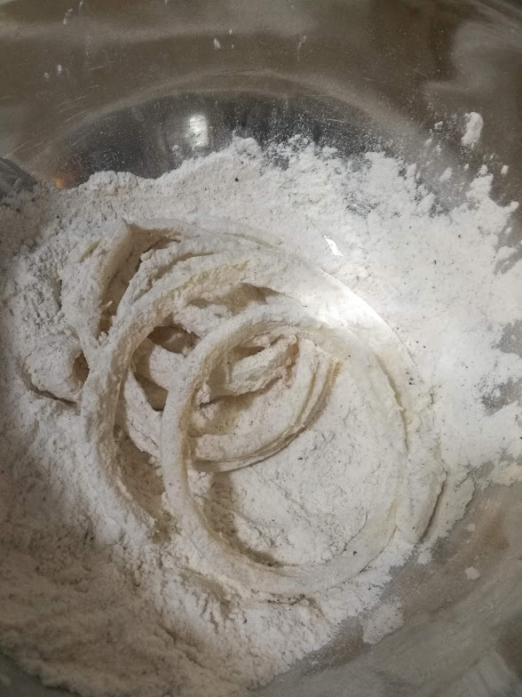 Cut the onions into rings, I made mine a little over a centimeter thick. I might make them a bit thicker next time, so use your preferences. Once the entire onion is cut, separate the rings from eachother, then soak them in the buttermilk for about 15 minutes. I stirred them about every 5 minutes but I’m not sure it needed it.