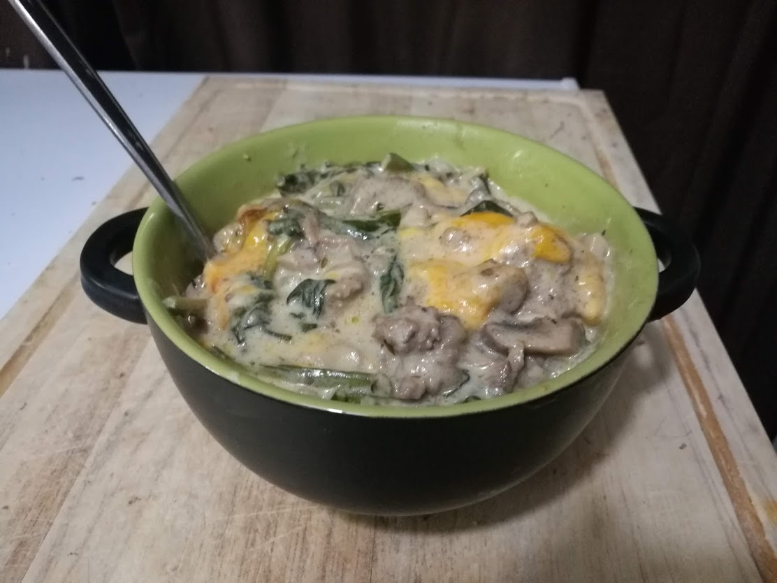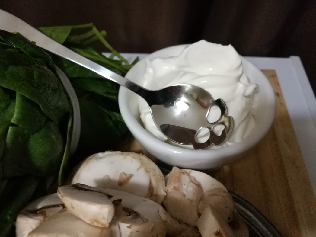 If you’re being extra, once the soup is made, add the sour cream and then the spinach. If you’re not being extra, mix the soup, sour cream and spinach. You then want to simmer it until it’s well combined and the spinach starts to wilt.