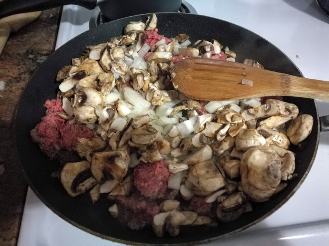 So preheat to about 375/190, then get your beef browning, chop up your onions and mushrooms. Then add them in with them. Don’t do what I do, I crowded the bejeebus out of the pan. But it still worked. Whatever.