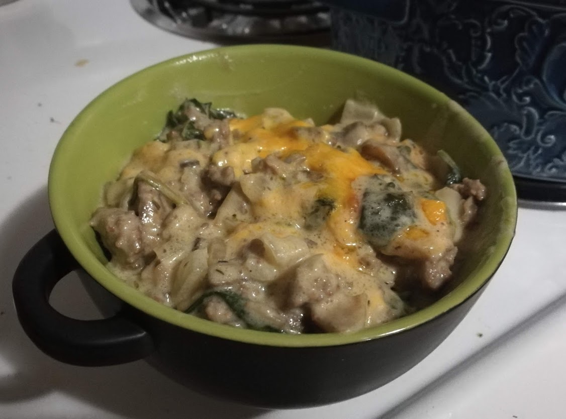 About 8 oz (225g) of mushrooms. This is technically optional, I love mushrooms, Sister Anders says that Vitamin D is good for depression and shit but that’s getting kinda personal. It also helps stretch the overall food out. So use it if you like mushrooms, it won’t destory it if you don’t.