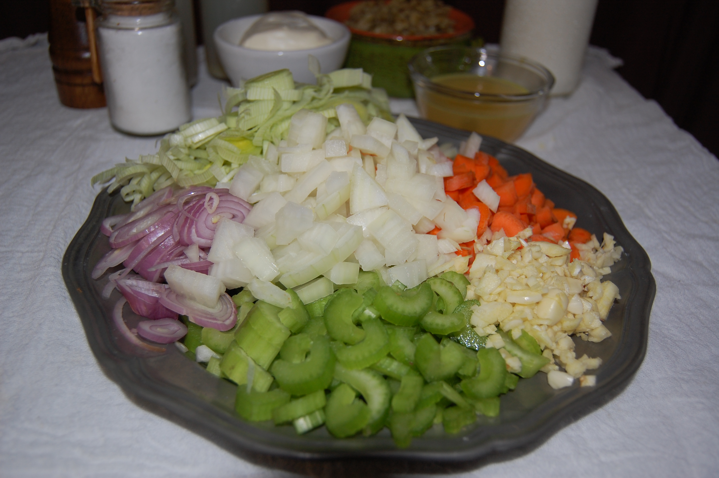 - Wash and chop all the things. Celery, carrots, onion, shallot, leek and garlic