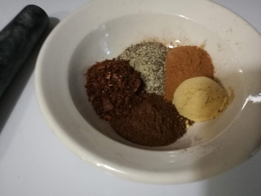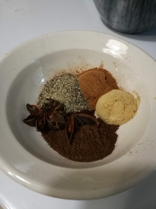 Get your five spices. Black pepper, cinnamon, ginger, clove and star anise. Get ground if you can. The ratio is 1:1 for all of these, so I used a teaspoon. But the problem I ran into is that I couldn’t find powdered star anise.