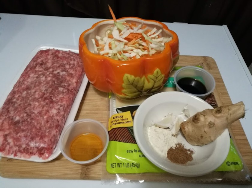 So you also need a pound of meat. I recommend white meat. I used Mushan for this, but you can also use pork or chicken. You will need 2.5 cups of shredded coleslaw. You can go about this two ways: the lazy way, which is getting a package of pre-shredded slaw from your grocer, or the amazing-person way, which is to shred about a quarter of a head of cabbage and one carrot.