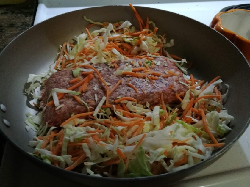 - Combine meat, sesame oil and cabbage mix and cook until meat is almost cooked through and cabbage mix is wilted down