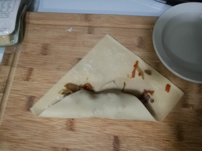 - Fold the corner nearest you over the filling