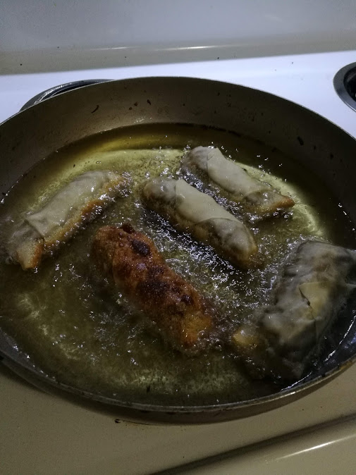 While you’re rolling them, get some oil to 350F/175C. Once you’re all done, CAREFULLY put them in the oil (I used about two centimeters worth of oil, enough to cover half an eggroll) and let them start to cook. They move pretty fast, so adjust your temperature as needed.