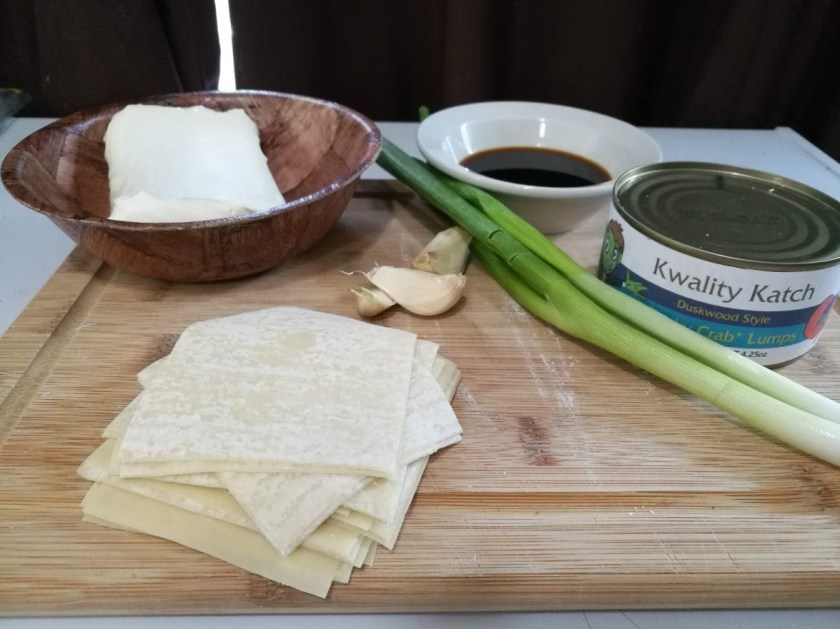 Alright so let’s get to it! Cast of characters! Two green onions. I used the white, finely minced, and about half of the green, leaving the rest of the green for garnish. You also need some about 3×3 inch wonton wrappers. I cut down the same wrappers I used for eggrolls which got me to the right size. You also need 8 oz of cream cheese, 2 tsp each of soy and fish sauce, and three cloves of garlic.