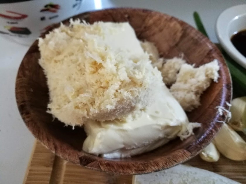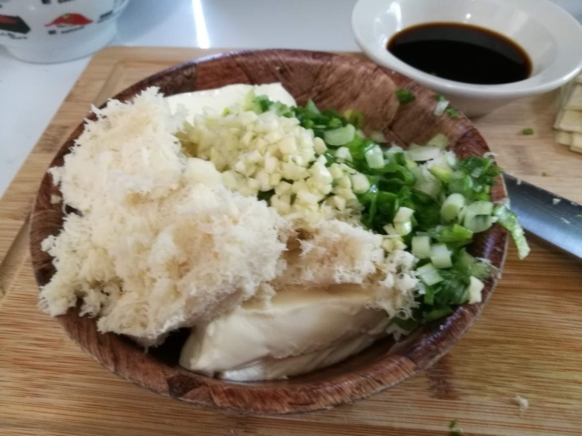Into the bigger bowl, and add your fish sauce and soy sauce. Some recipes call for sugar, and if you like your rangoons a bit sweeter, add about half a tablespoon of white sugar. Me? I like it savory, so I omit this.