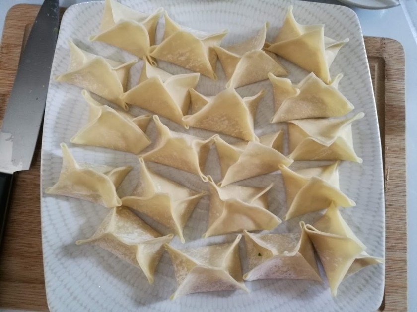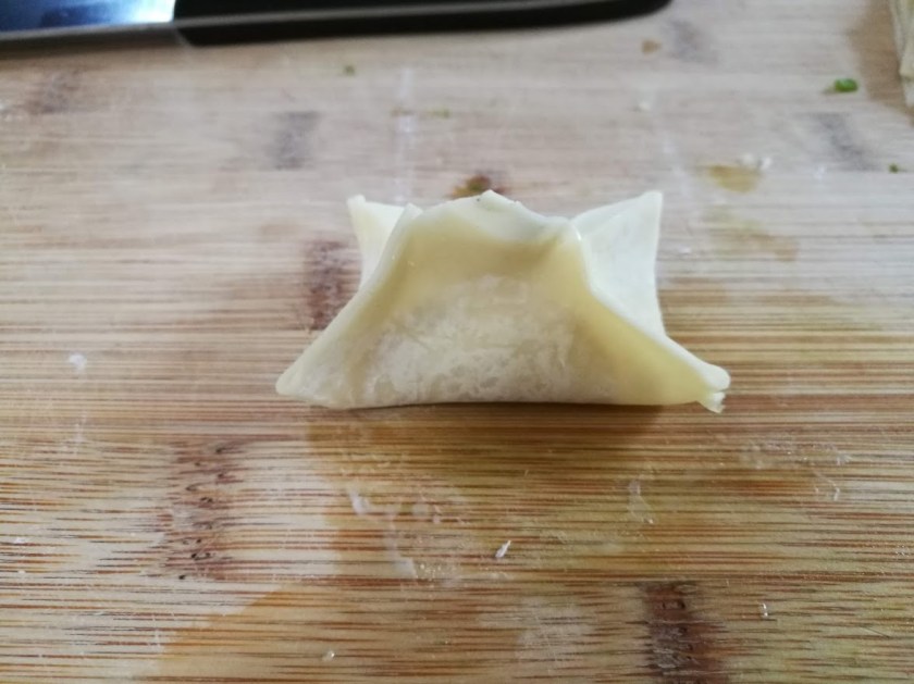 - Place 1 tsp of filling in the middle of the wonton wrapper and wet the edges