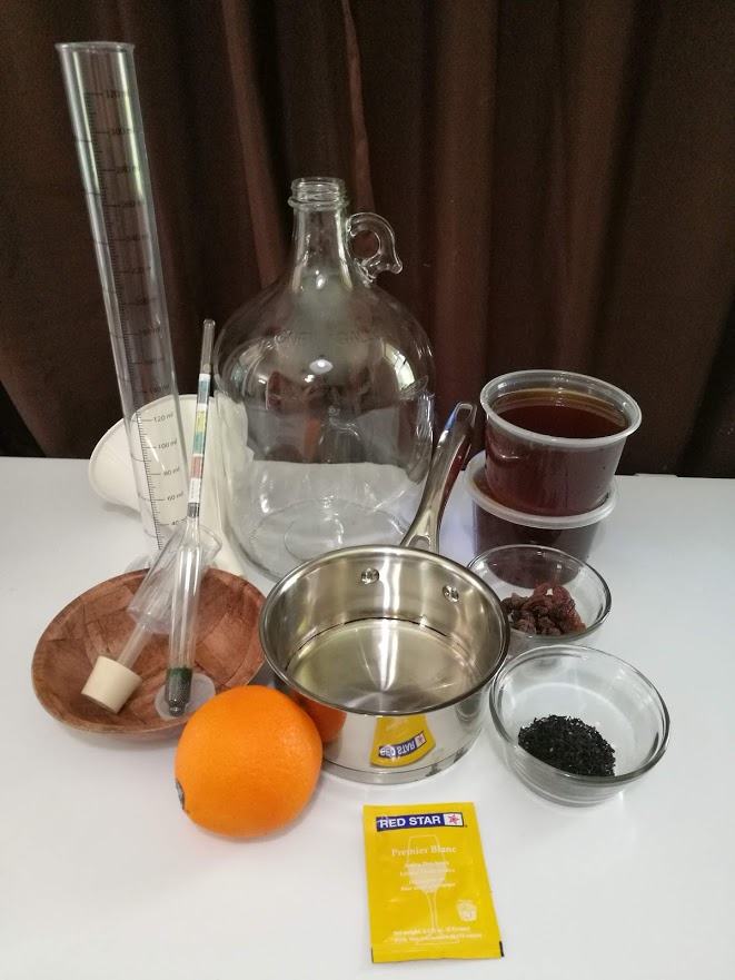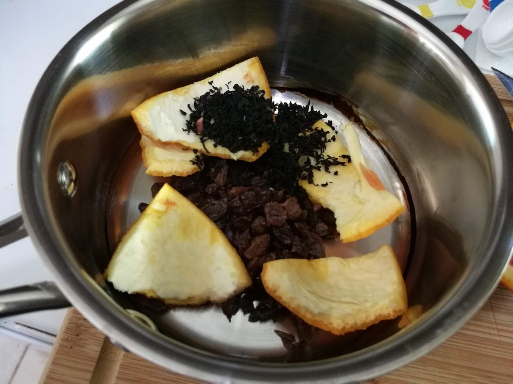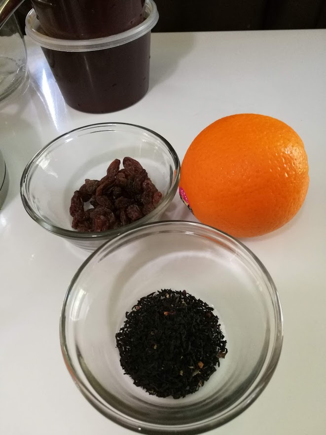 Remember how I said the kit came with a yeast nutrient? Well I don’t want to use that, I want to keep this as ‘traditional’ as possible, so we’re going to do things a little differently. I will be using the peel of half of an orange, about a handful of raisins, and about a tablespoon of loose, black tea. If you only have bags, that’s about two or three bags. It’s not super exact, don’t stress on this part.
