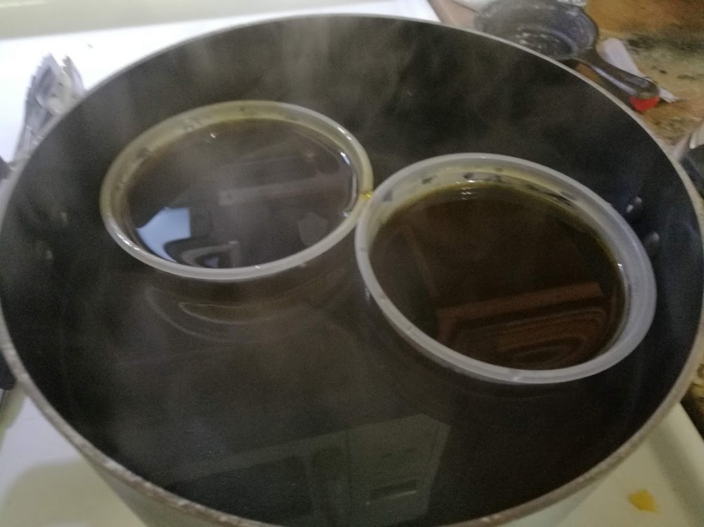 We want to get our honey into the carboy, so our first step is to heat it up to make it easier to pour. Fill a pot with water, bring the water to a boil, then take it off the heat and set your honey in it to warm up.