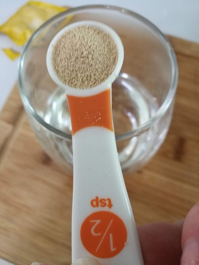 First the yeast. Use 1/2 teaspoon and put it in about a quarter cup of warm (NOT HOT) water. We’re just trying to hydrate it so that it’ll be dissolved and ready to start monching on the sugars.