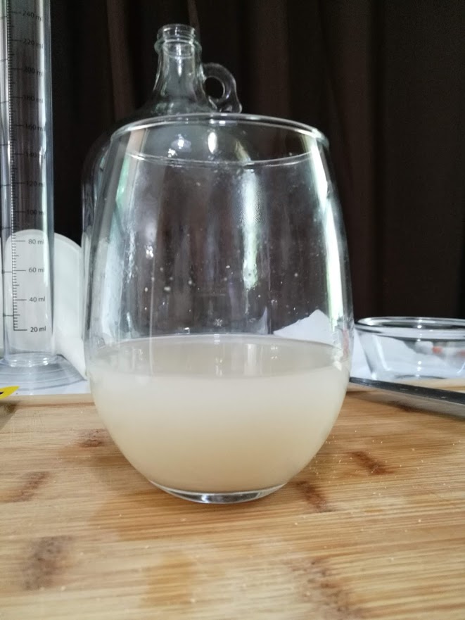 This is a bung and airlock. Basically it’s a stopper with a hole in it, and the airlock lets the carbon dioxide that comes from the yeast out, without letting anything nasty in. Yeast is a living thing, and when you ferment honey (or anything, really), it eats the sugar and lets out waste in two forms – alcohol and carbon dioxide. The carbon dioxide builds up and needs somewhere to go. When it’s in suspension, that creates the fizz, or carbonation. But when there’s too much, it creates bottle bombs. Like when you leave a bottle out somewhere hot and it explodes. Same idea. So the air lock allows the carbonation to come out and relieve the pressure, without letting any air or bugs into the booze.