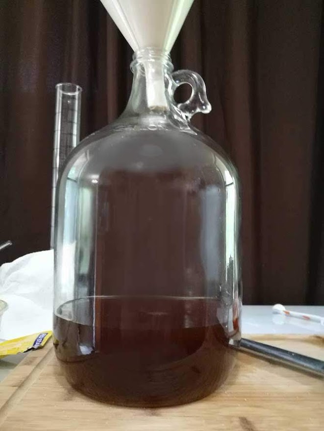 I like StarSan, it’s easy to use and a little goes a long way. But for this batch I just used a cap of bleach in 2 gallons of water. Sanitize your funnel, sanitize the bung, sanitize the airlock (more on that in a minute), sanitize your hydrometer AND your cylinder, sanitize your carboy — if it’s going to be in contact with it, sanitize it. The tea itself has been boiled, so we’re not worried about that.