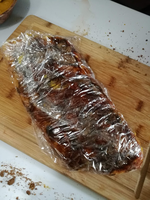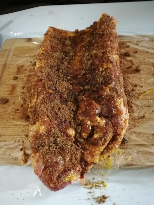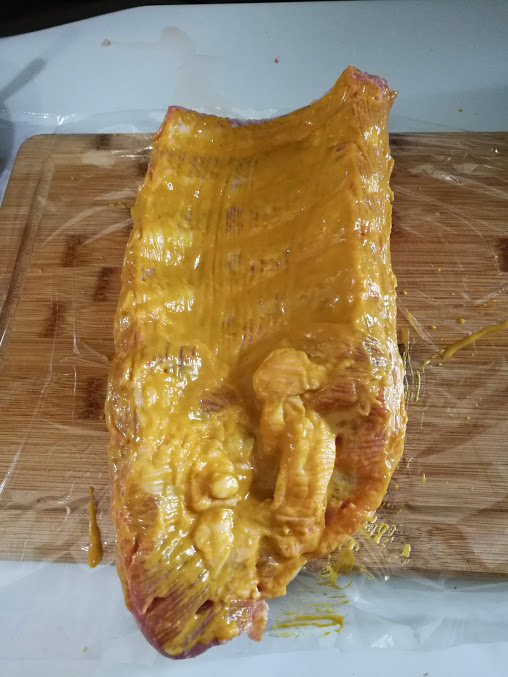 Put down some cling wrap and set the ribs on them. Then generously coat both sides in the wet rub. You are going to be wrapping it in the cling wrap so make sure you have enough.