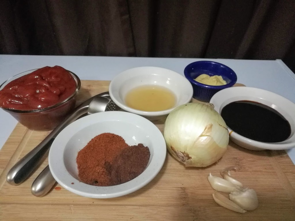 Next to that is a cup of yellow mustard, below that a quarter cup of tomato ketchup. The dark stuff is a quarter cup of liquid smoke. This is ONE of the ingredients that will help us get that smokey taste. The other is a secret. You’ll never guess it.
