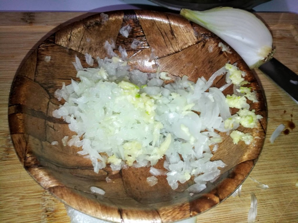 Grate half of the onion and smoosh the garlic into it so that you have a very unflattering mess of stuff that wants very badly for you to cry.
