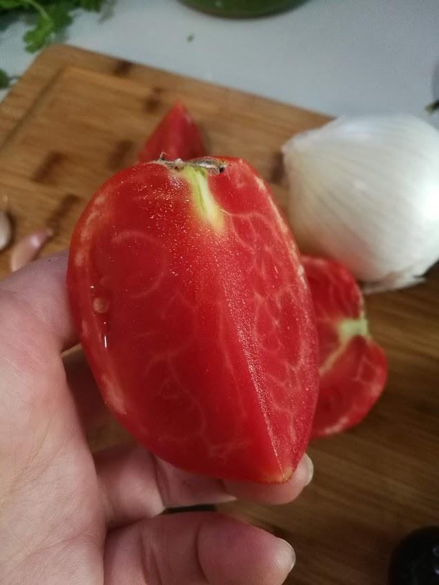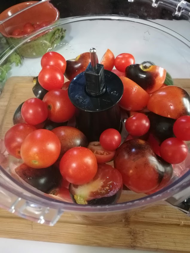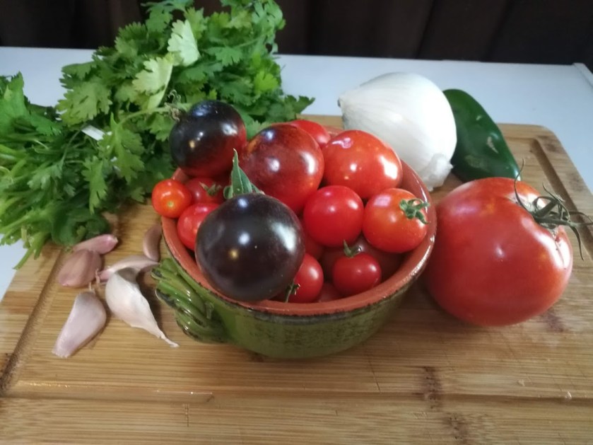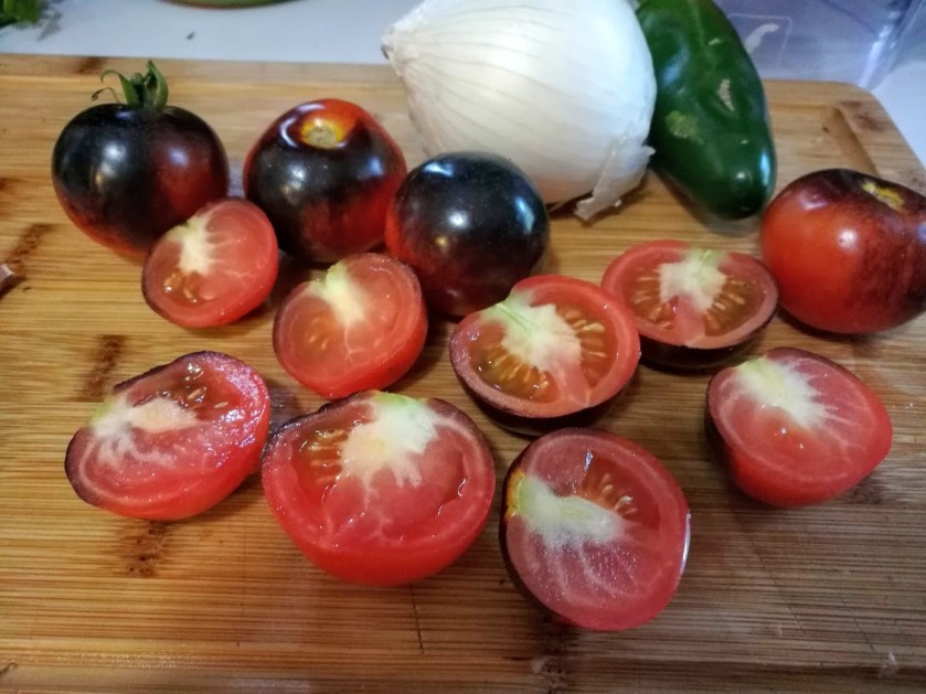 I had a whole bunch of tomatoes from my garden, as you can see, there were some black felberries, some tiny cherry tomatoes and a big slicer here. It would probably be the equivalent of 4 large tomatoes from the store, or a can and a half of chopped tomatoes (drained).