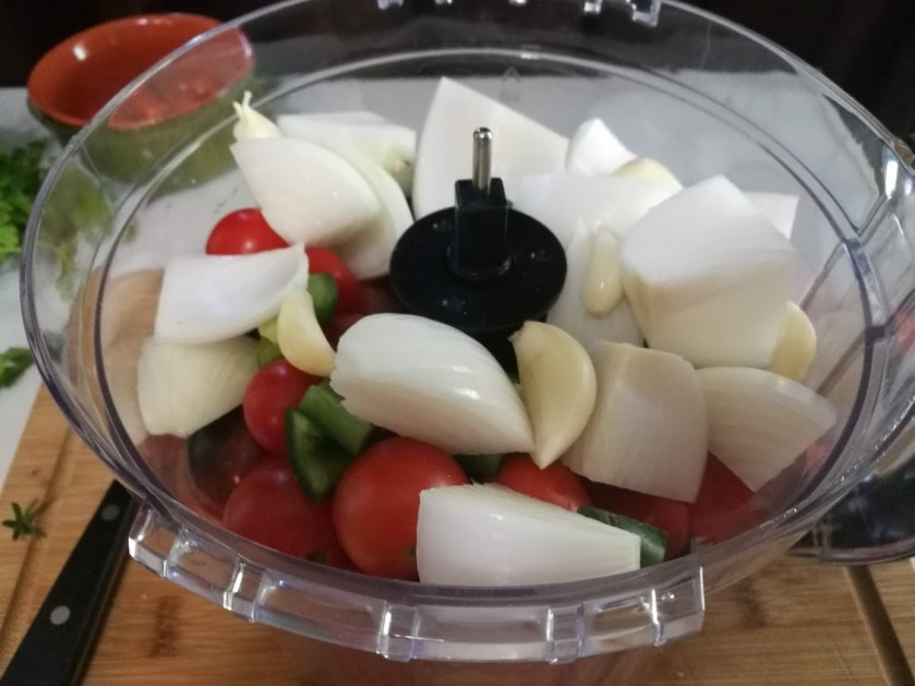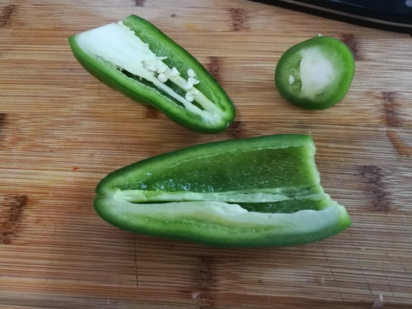 Cut them down enough so that you can get them into a food processor. I ended up not using the entire amount and got two jars. Next, I like a bit of kick, so I halved and de-seeded a jalapeno and coarsely chopped up some onion. Throw in a few garlic cloves for good measure as well.